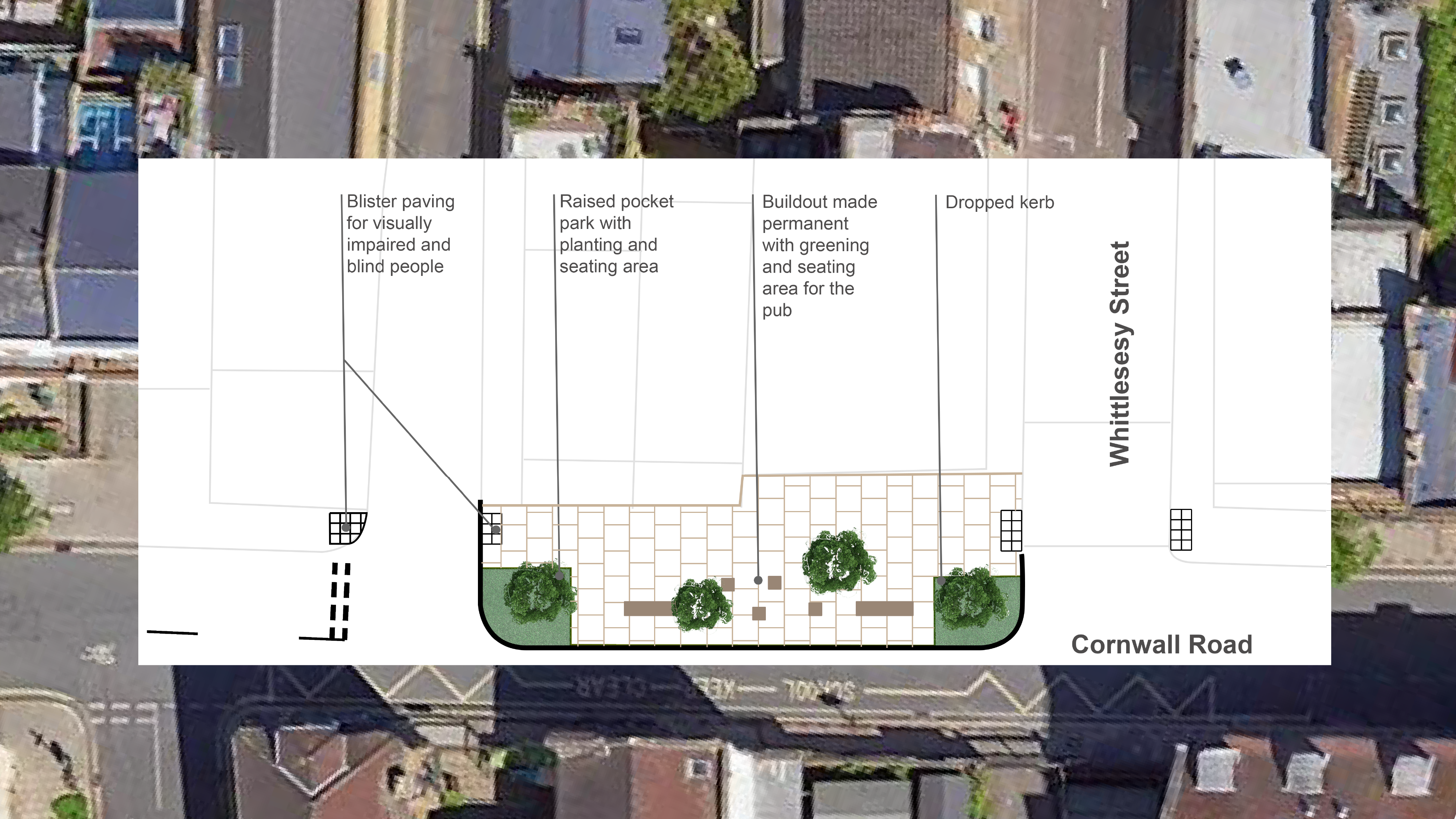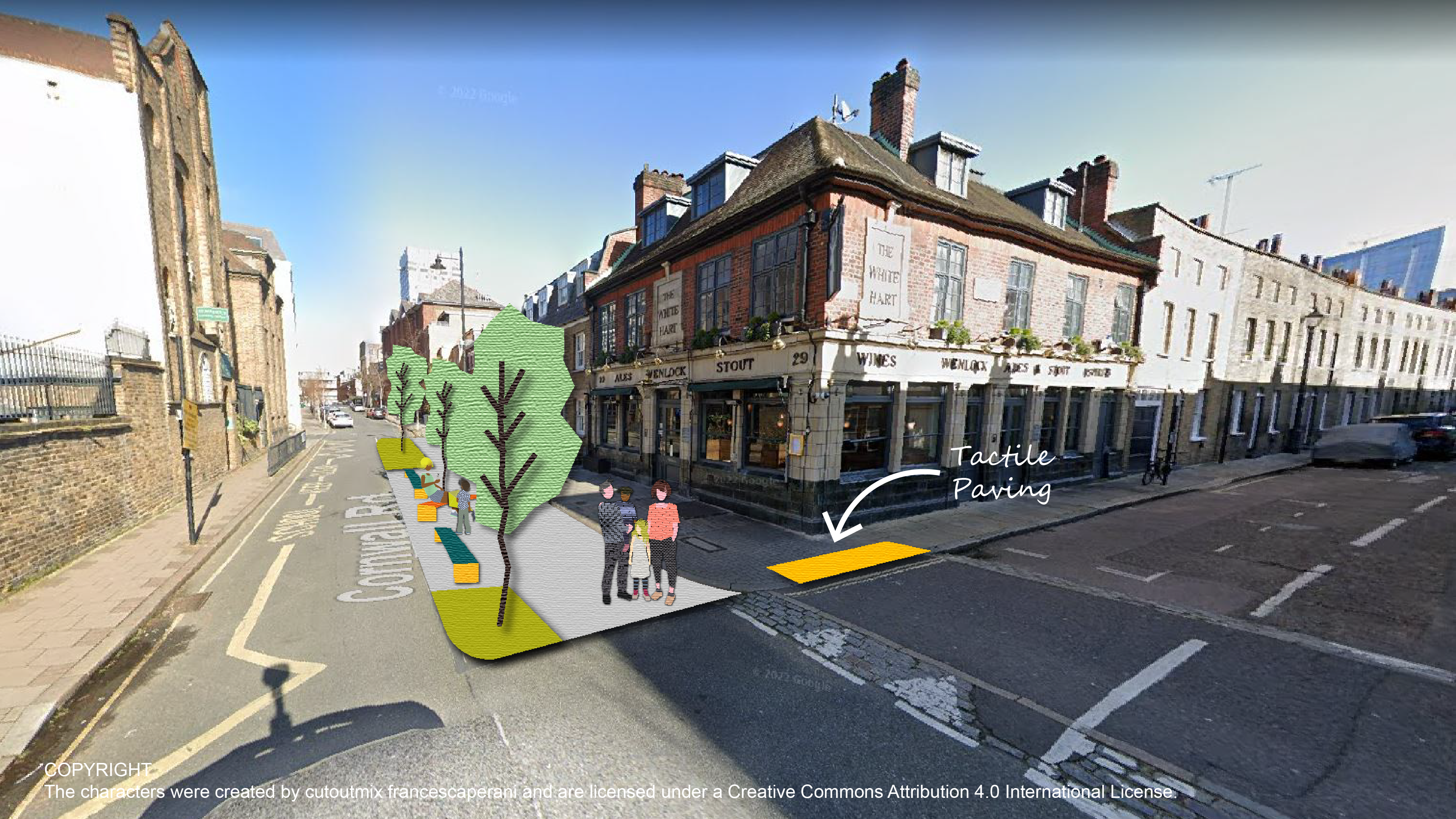 During the Covid-19 pandemic, a section of carriageway was converted to pedestrian space to slow traffic and give The White Hart more space to trade outside. Whilst this intervention has been made permanent, we now want to formalise the pavement widening with proper materials