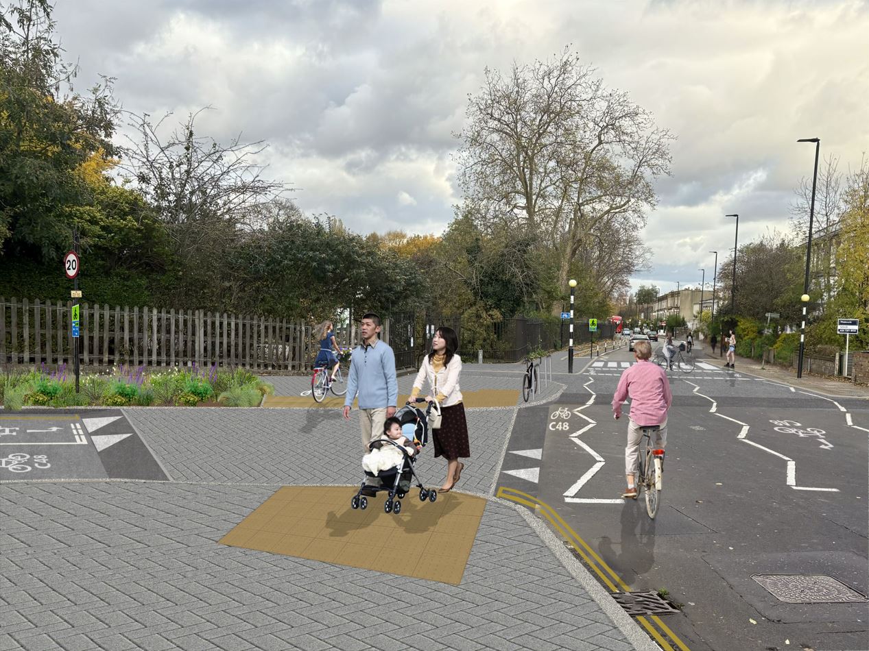 - Raised continuous footway across the minor road junction (Brockwell Park Gardens) to make it easier for pedestrians to cross and to make pedestrian priority explicit, reduce motor vehicle speeds entering and exiting the minor road and enable people cycling to join the cycleway safely.
