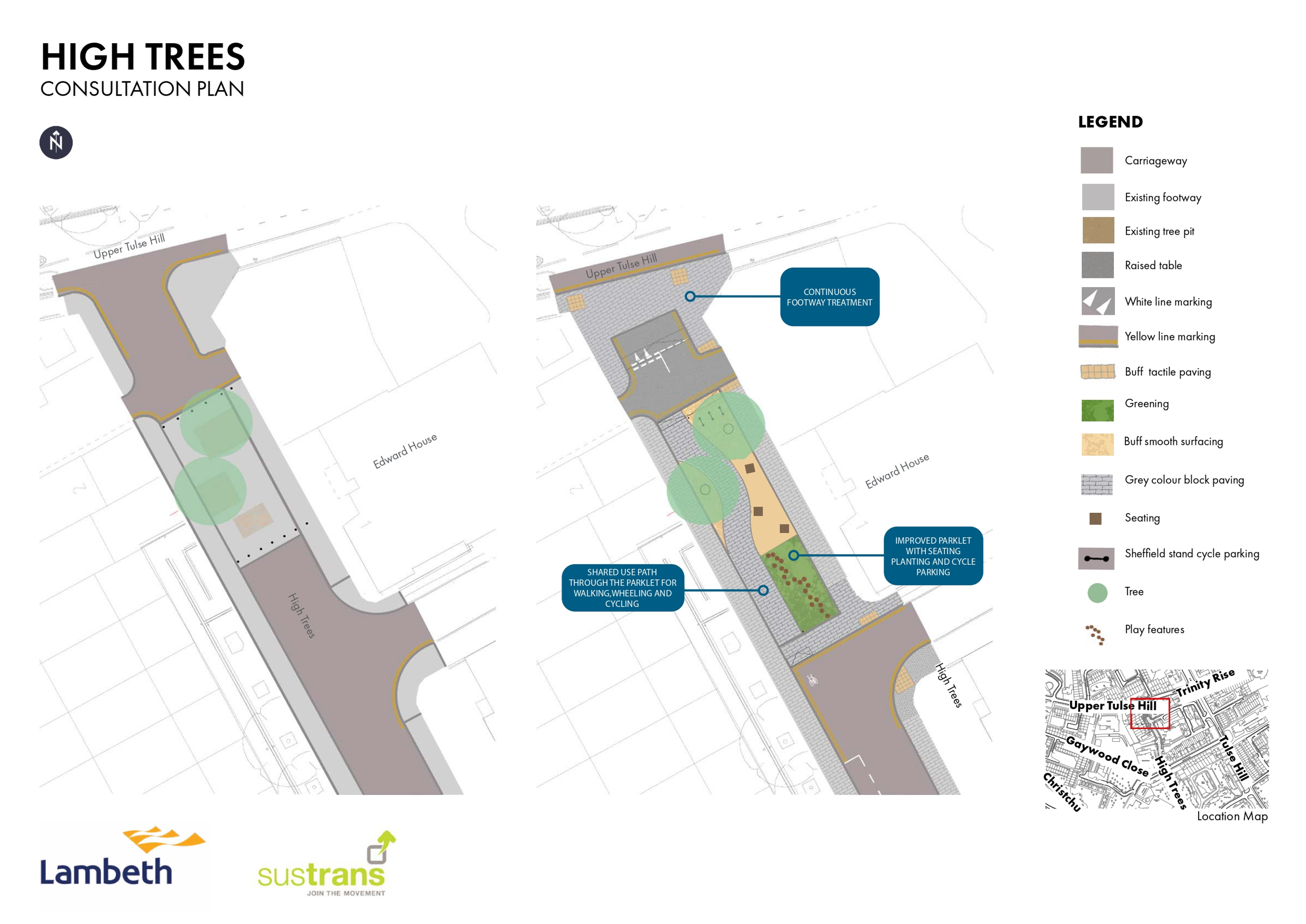 - Buff-coloured blister tactile paving either side of the crossing point, to guide visually impaired pedestrians when crossing the High Trees junction