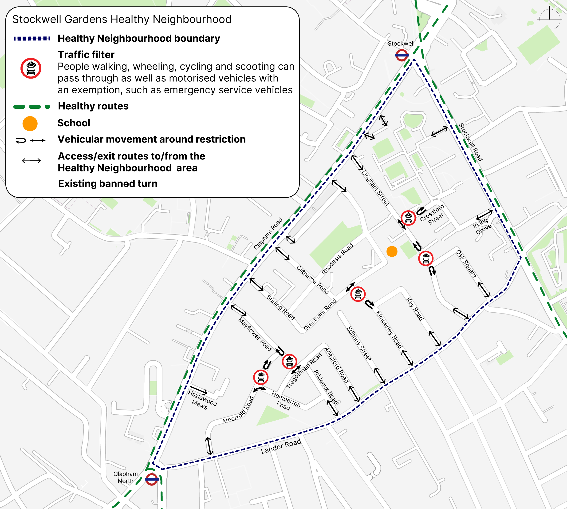 Parking and Enforcement Group (Resident Services), London Borough of Lambeth, PO Box 80771, London, SW2 9QQ (quoting the reference Stockwell Gardens Healthy Neighbourhood)