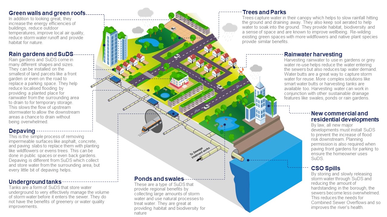 Sustainable Drainage Systems (SuDS) can be groups or individual features that manage rainwater to minimise flooding and pollution. They mimic the natural water cycle by allowing water to be collected in the ground, stored and then slowly released back into the drains. Some SuDS can be designed to release the water in to the soil through a process called infiltration, and removes the need for drains. Lambeth's clay soil prevents the use of infiltrating SuDS and so the borough will always be heavily reliant on the combined sewer network to drain.