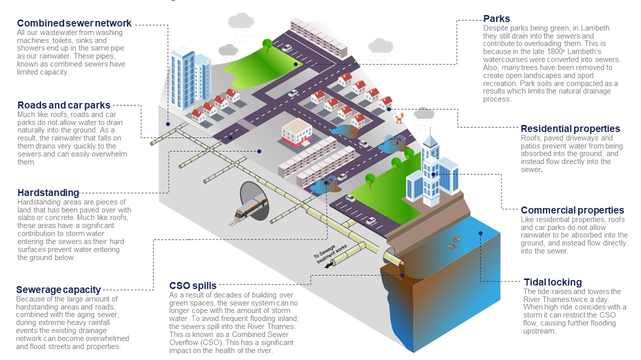 In the mid to late 1800s Lambeth's rivers were converted in to a sewer network. This has resulted in all our rain water and waste water being drained by the same system. Currently the majority of the borough is covered by hard surfaces like roofs, roads and patios which do not allow rainwater to drain into the ground. The remainder of the borough, like our parks also drains into this sewer as they have no open rivers to drain to. This produces a lot of water on the surface when it rains which very quickly enters the old Victorian sewer network. As a result the sewers cannot cope and become overwhelmed, flooding out on to streets and in to homes. During heavy rainfall the sewer is released in to the River Thames to help cope with the volume and rate of storm water. These releases are known as Combined Sewer Overflows (CSOs) and prevent large scale flooding but contribute to the poor health of our rivers.